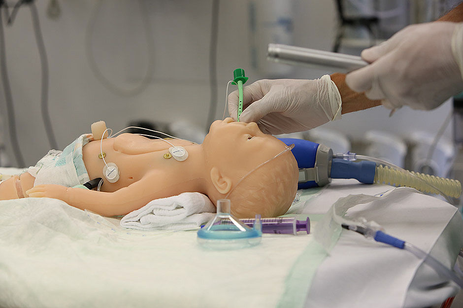 Intubieren wie die Profis – nicht nur Medizinstudenten, sondern auch ausgebildete Ärzte und Pflegefachpersonal trainieren und verbessern medizinische Eingriffe an einer Simulationspuppe, damit im Ernstfall jeder Handgriff sitzt. Der Winzling, der in der Kinderklinik am Universitätsklinikum Augsburg zu Hause ist, ist ein technisches Wunderwerk und entspricht einem ausgewachsenen Neugeborenen. Über einen Computer werden die Symptome des Simulationsbabys gesteuert. Bei den medizinisch realistischen Übungen legt ein Team am Computer die Aufgaben fest, welche die Kollegen am Operationstisch und auf der Intensivstation erfüllen müssen. Das kann mit dem Legen eines Zugangs zum Einführen von Infusionsflüssigkeiten beginnen und mit einer Wiederbelebung des Neugeborenen enden. So können junge Ärzte wertvolle Erkenntnisse sammeln, während erfahrene Mediziner ihr Wissen vertiefen und festigen.