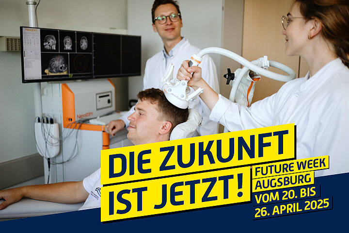 Hightech fürs Gehirn: Individuelle Gehirnkartierung mittels Magnetstimulation live erleben! Wie funktioniert unser Gehirn, wo liegen welche Funktionen – und wie können Ärztinnen und Ärzte es präzise kartieren? Bei der Future Week öffnet die Klinik für Neurochirurgie des Universitätsklinikums Augsburg ihre Türen und zeigt, wie individuelle Gehirnkartierung mit navigierter transkranieller Magnetstimulation (nTMS) heute schon möglich ist. In ca. 10 Minuten und ganz ohne einen chirurgischen Eingriff können Funktionen wie die Bewegung der Hand und die Sprache im Gehirn lokalisiert werden. Entdecken Sie innovative Technologien der Gehirnforschung, erfahren Sie, wie sie in der modernen Neurochirurgie eingesetzt werden, und kommen Sie mit unseren Expertinnen und Experten ins Gespräch. Wer ein eigenes Gehirn-MRT (auf CD) mitbringt, kann sogar selbst erleben, wie eine solche Untersuchung funktioniert.