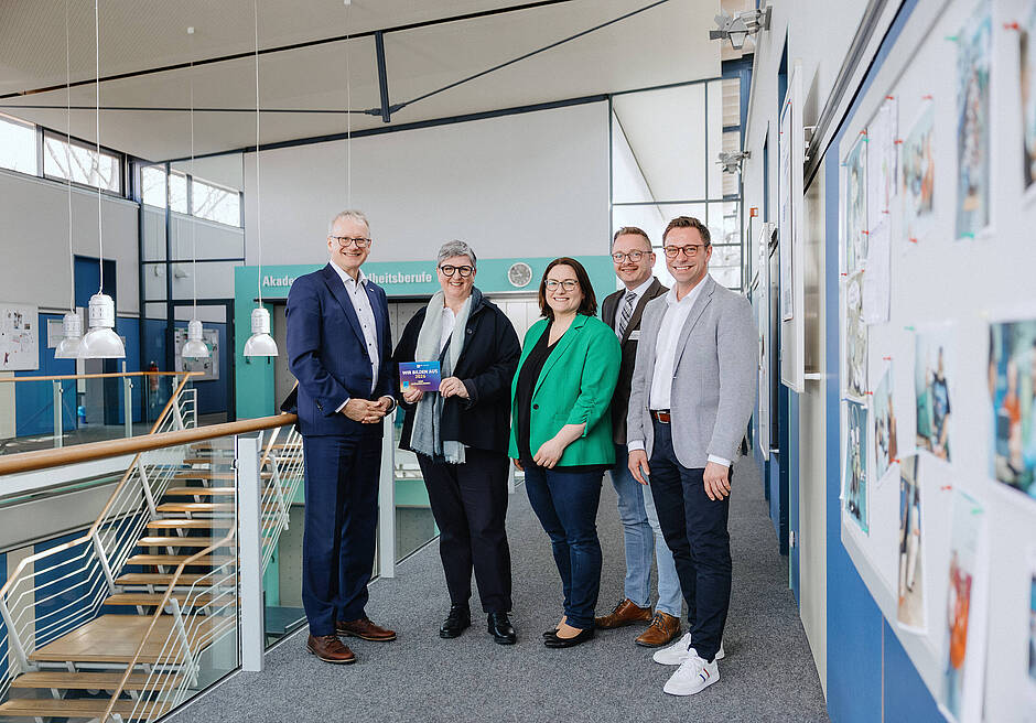 Das Bild zeigt von links: Jens Walter (IHK), Susanne Arnold, Ruth Hintersberger, Jochen Geisenberger, Andreas Schnabel (alle UKA). Foto: Samuel Tschaffon/Universitätsklinikum Augsburg