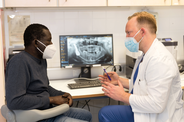Risse, Quetschungen, Brüche, Bisswunden: Assistenzarzt Hiller kennt selbstverständlich die ganze Palette von Gesichtsverletzungen aus der täglichen Praxis im Universitätsklinikum Süd in Haunstetten. »Aber solch massive Folgeerscheinungen wie bei Herrn J. sieht man hierzulande selten,« fasst der 35-Jährige seine erste Begegnung mit Muhammed J. Anfang 2020 zusammen. »Der rechte Kiefergelenksfortsatz war völlig deformiert und mit der Schädelbasis verwachsen. Dazu litt er an einer Lähmung der rechten Gesichtshälfte.« Dadurch fehlte dem Patienten aus Afrika, der von einer niedergelassenen kieferchirurgischen Praxis an die Uniklinik überwiesen wurde, nicht nur die Gesichtsmotorik. Er war auch nicht fähig, den Unterkiefer nur einen Millimeter zu bewegen, zu sprechen, zu gähnen oder gar Mundhygiene durchzuführen. Zudem konnte er ausschließlich flüssige oder breiige Nahrung zu sich nehmen – und das über Jahre.