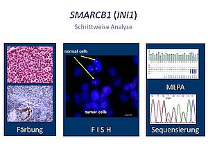 Zytogenetisch und molekulargenetisch (Abb. 4) lassen sich in fast 100% aller rhabdoiden Tumoren Mutationen oder Deletionen des SMARCB1-Genortes auf Chromosom 22q11.2 nachweisen (Jackson et al 2009). Diese verursachen in der Regel alle einen SMARCB1/INI-1 Verlust.