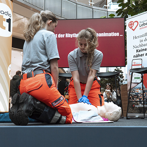 Bereits zum zehnten Mal luden UKA und Augsburger Hilfsorganisationen zum Tag der Wiederbelebung in die Citygalerie. Ziel: Ängste vor Erster Hilfe abbauen und zeigen, wie lebensrettend einfache Handgriffe sind. Expertinnen und Ehrenamtliche, sowie Ärzte des Universitätsklinikums beantworteten Fragen und gaben Tipps, wie man im Notfall richtig reagiert und demonstrierten Wiederbelebung in live-Übungen. Hauptbotschaft: „Jeder kann Leben retten – und jeder soll wissen, wie es geht“, erklärte Prof. Dr. Axel Heller.