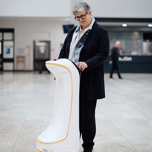 Das Pilotprojekt der Stabsstelle Digitalisierung und Pflegewissenschaft am UKA setzt Serviceroboter zur Optimierung der Abläufe im Praxistest ein. Pflegedirektorin Susanne Arnold besucht den Ketty-Bot in der Strahlenambulanz, wo er bei Hol- und Bringdiensten und für Transport und Serviceeinsätze eingesetzt wird. Auch in der Eingangshalle soll er Besuchende zur Orientierung dienen. Der Roboter soll künftig Pflegeabläufe unterstützen, Prozesse optimieren und die Mensch-Maschine-Interaktion verbessern.